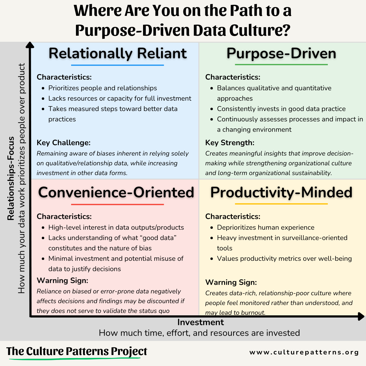 Data cultures in organizations take many forms. They vary in how much they center the experiences of people, and how much they prioritize simply having data. They also differ in how much time, effort, and resources they dedicate to building their data cultures.